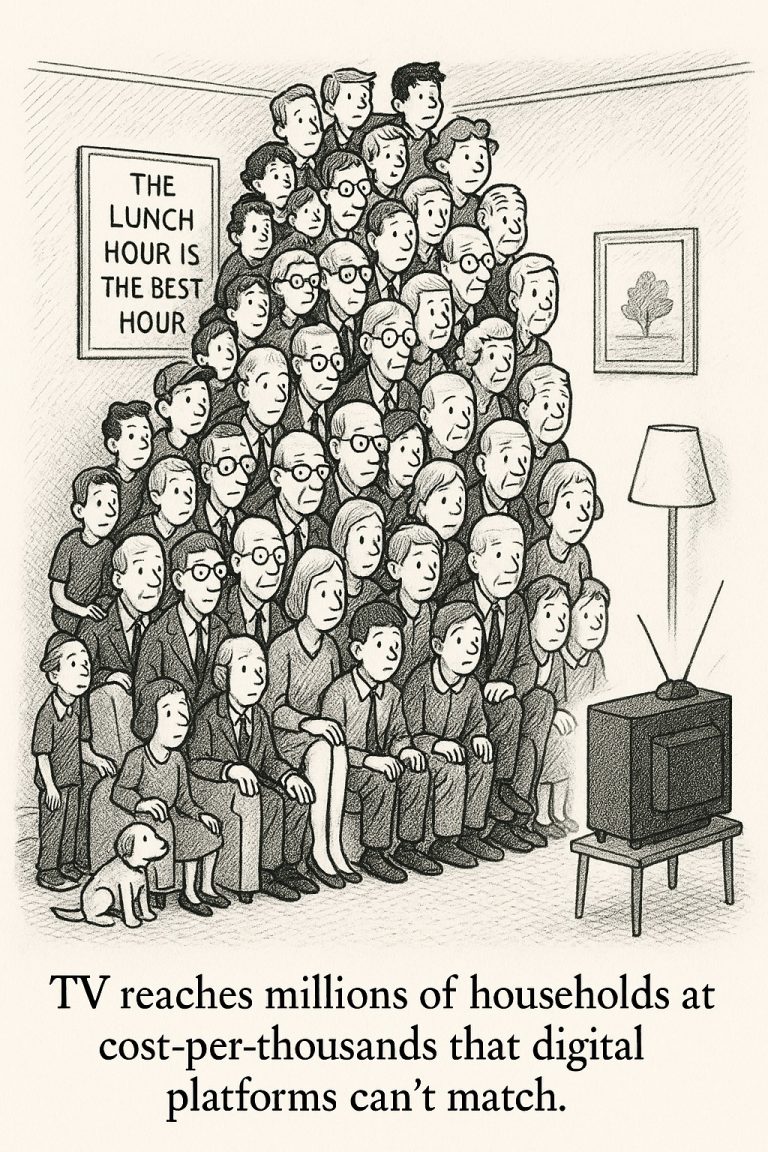 - Broad reach at low CPM: TV reaches millions of households at cost-per-thousands that digital platforms can’t match.